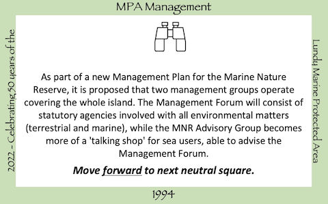 Overall management of the MPA at Lundy relies upon input from two main sources: a variety of ‘tools’ to assist in informing users of the MPA what is permissible and what is not; and a variety of people to oversee the conduct of the users of the MPA.